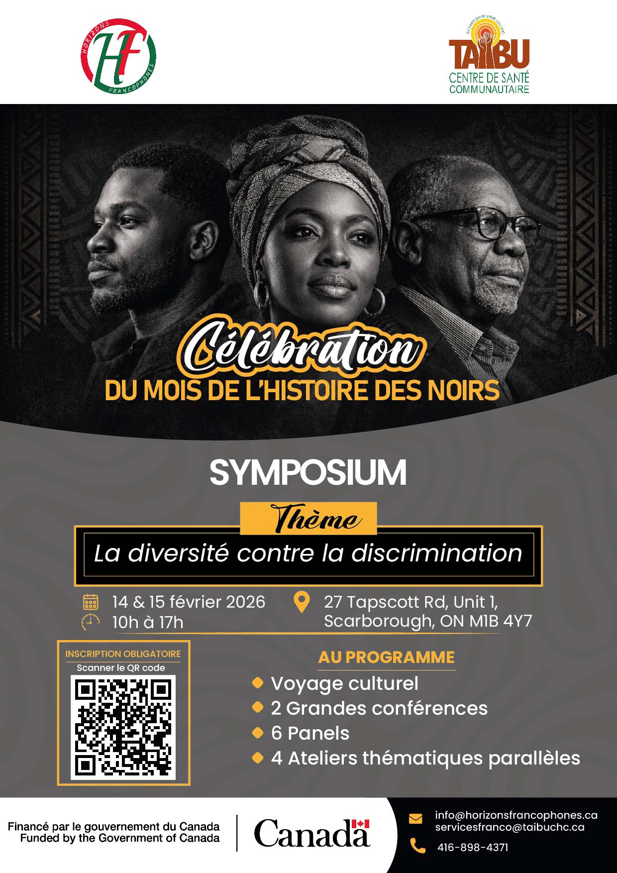 Dans le cadre de la Célébration du Mois de l’histoire des Noirs, Horizons Francophones, en partenariat avec le Centre de santé communautaire TAIBU, organise les 14 et 15 février 2026 un Symposium sur le brassage culturel au sein des communautés noires francophones. Placé sous le thème « La diversité contre la discrimination », cet événement se veut un espace structuré de dialogue, d’apprentissage et de co-construction réunissant leaders communautaires, experts, jeunes et membres des communautés.